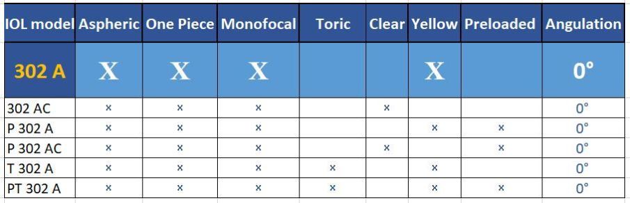 A : Aspheric Yellow Lens AC : Aspheric Clear Lens T : Toric P : Preloaded
