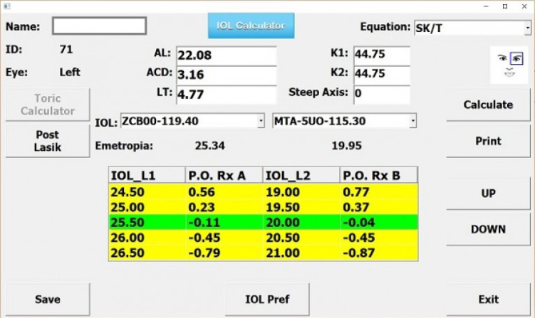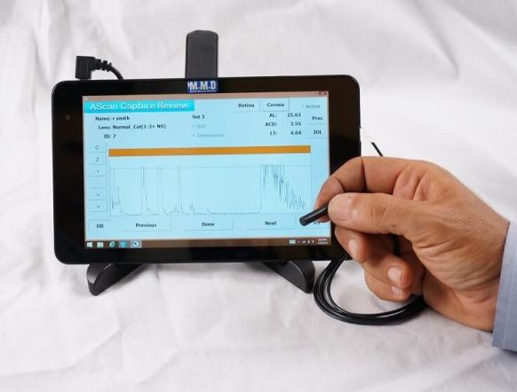 Through the use of ultrasonic waves, the A2000 is able to quickly measure thicknesses of the anterior chamber, lens, and axial eye length to calculate the required IOL (intraocular lens) for a patient before surgery.
