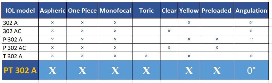 A : Aspheric Yellow Lens AC : Aspheric Clear Lens T : Toric P : Preloaded
