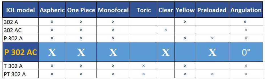 A : Aspheric Yellow Lens AC : Aspheric Clear Lens T : Toric P : Preloaded